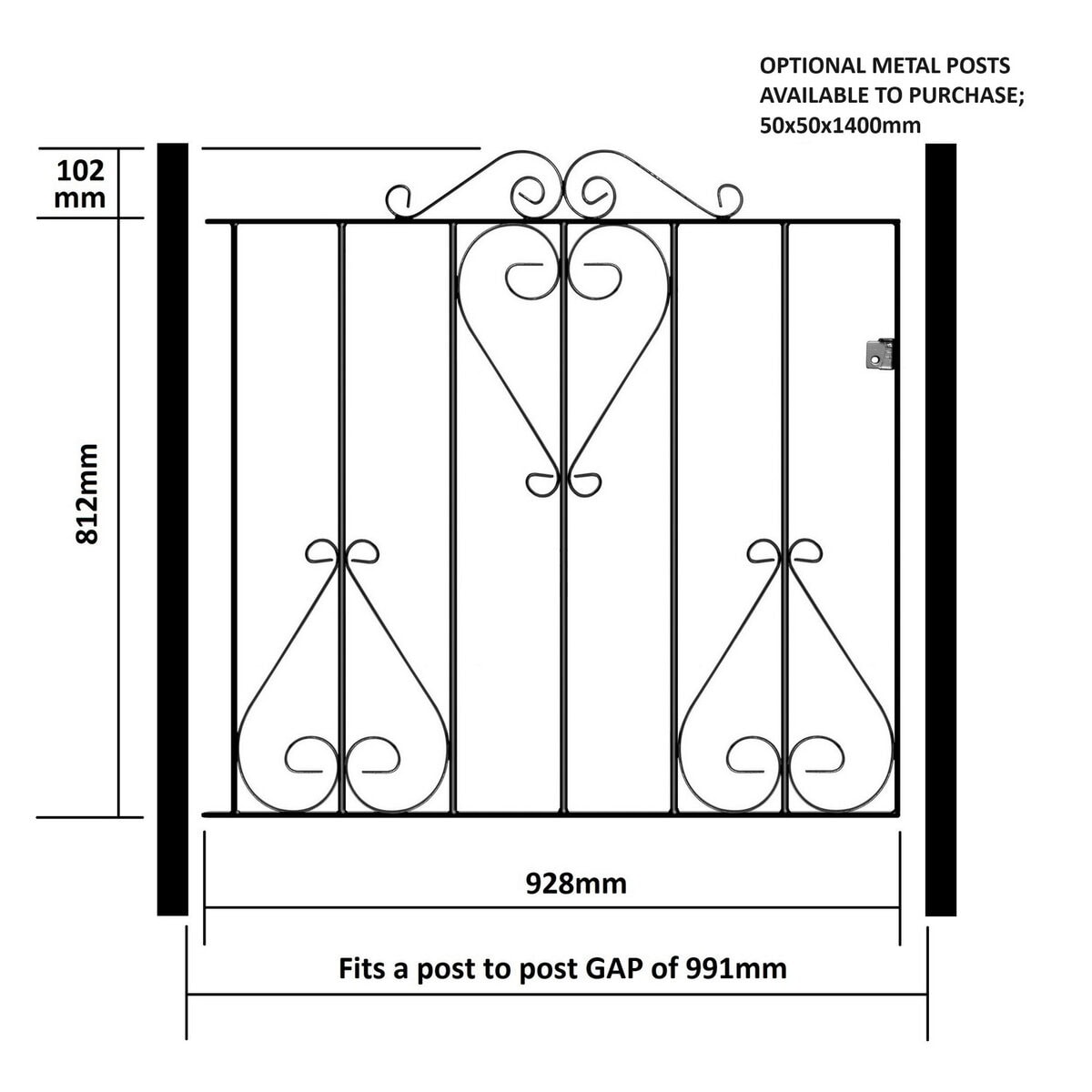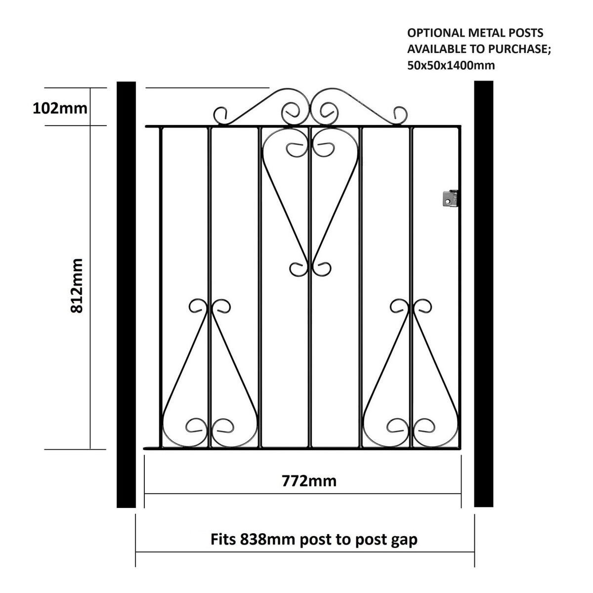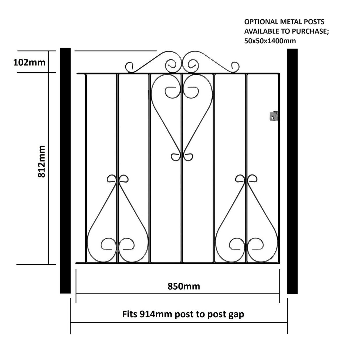 Fits a total post to post GAP as stated in the size selection. Gate frame height is 812mm and 914mm to top of scrolls. We already account for the hinge and latch gaps within the width measurement listed.