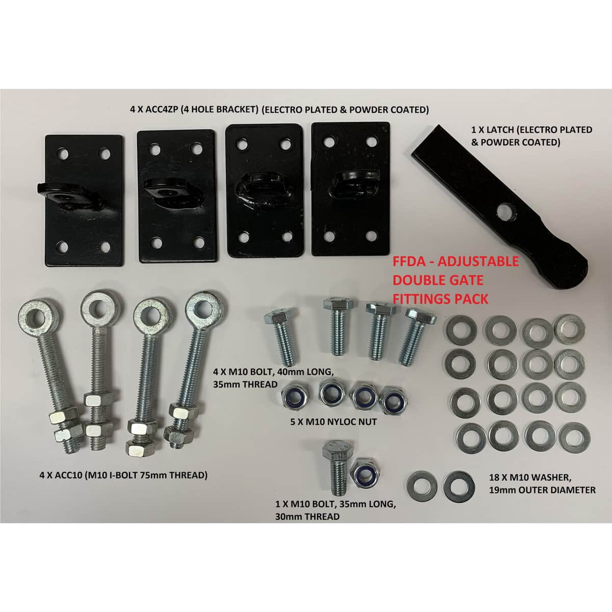 Fittings included; comes with hinge brackets, bolts, tip latch and 2 drop bolts. (No screws or wall plugs included) Nuts and bolts must be painted after fitting to prevent the onset of rust.