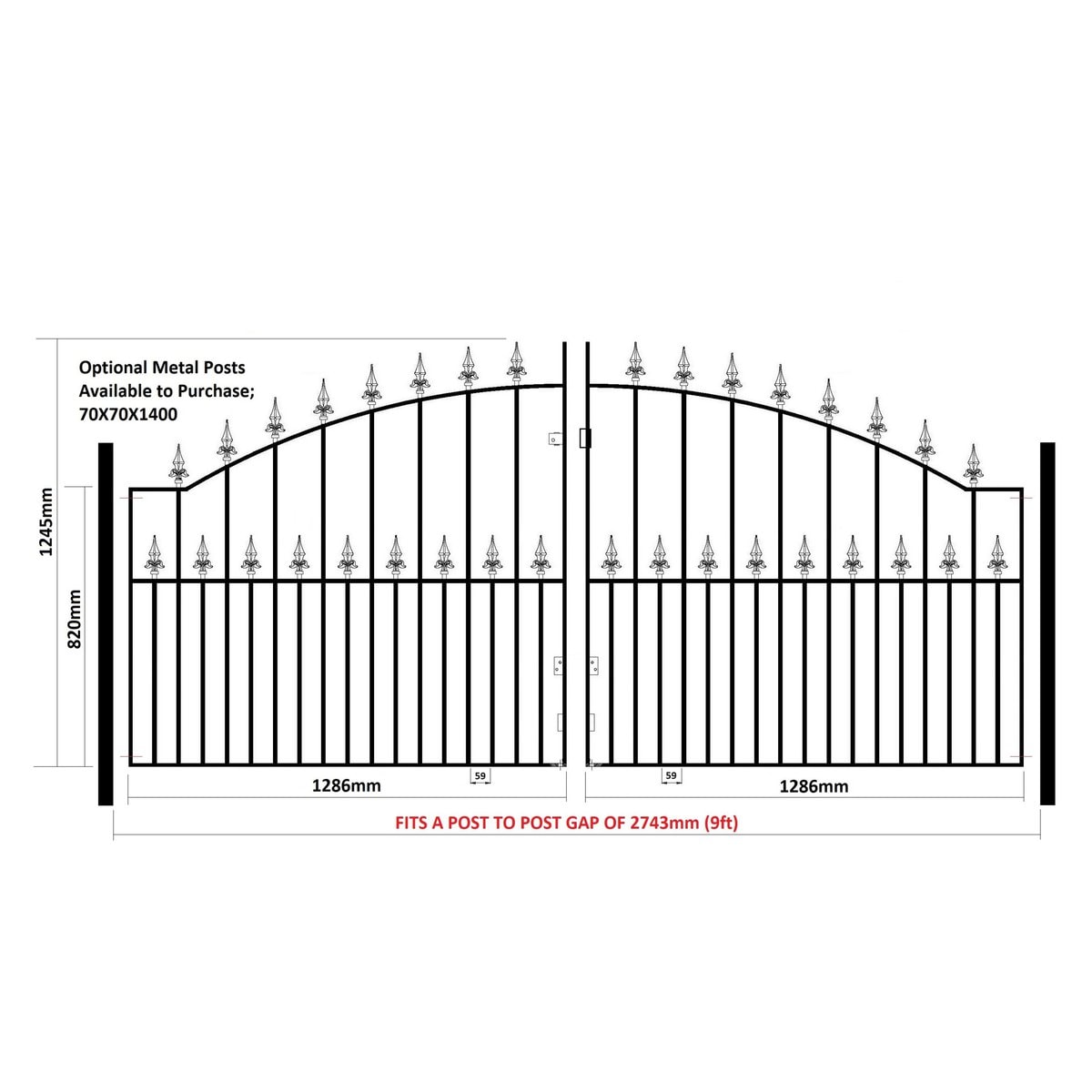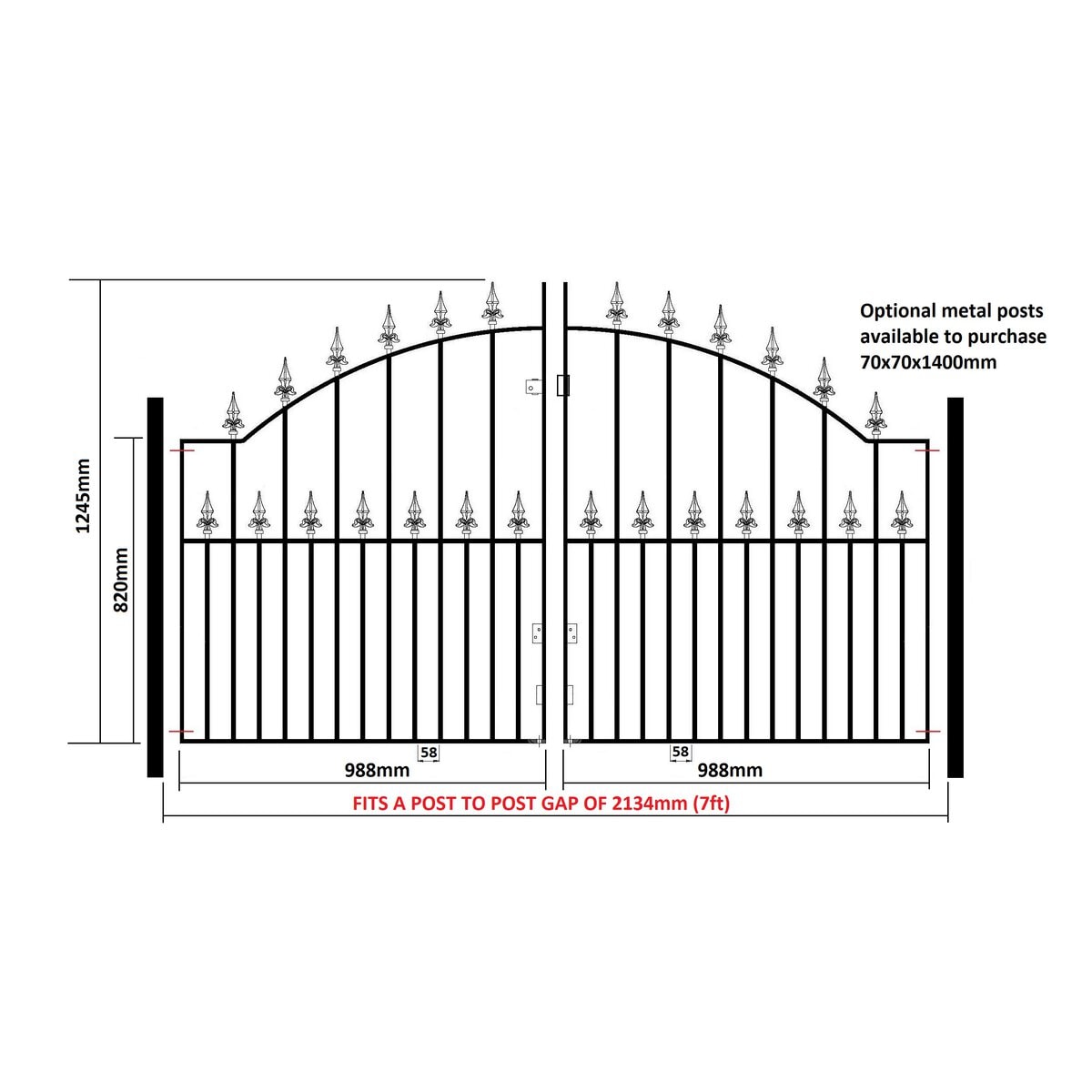 The metal driveway gate fits a total post to post GAP as stated in the size selection. Gate side frame shoulder height is 820mm rising to 1255mm to top of spear finial in the centre. We already account for the hinge and latch gaps within the width measurement listed.