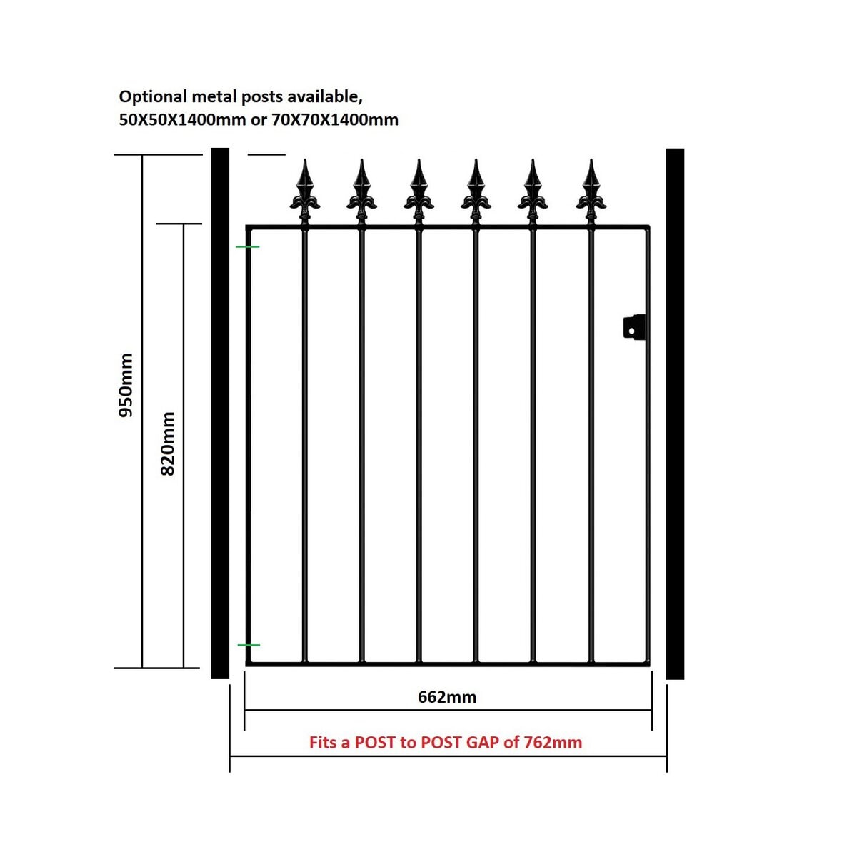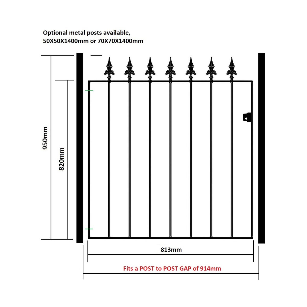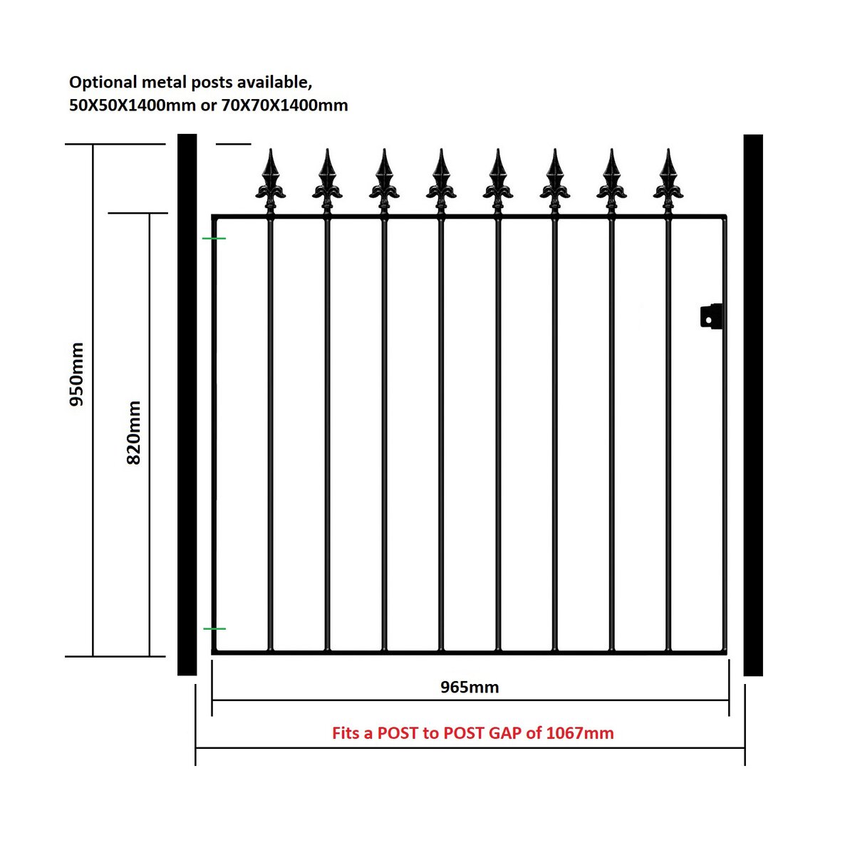 The spear top gate fits a total post to post GAP as stated in the size selection. Gate side frame shoulder height is 820mm and 950mm to top of spear finial. We already account for the hinge and latch gaps within the width measurement listed.