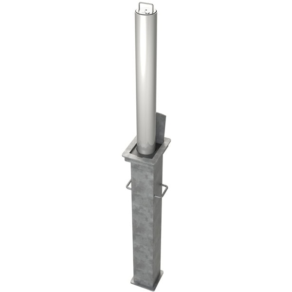 Round Stainless steel telescopic post, 90mm x 90mm, 5mm wall, 670mm above ground, 10 pin high security integral lock, keyed alike or to differ. Grade 304 brush satin finish
