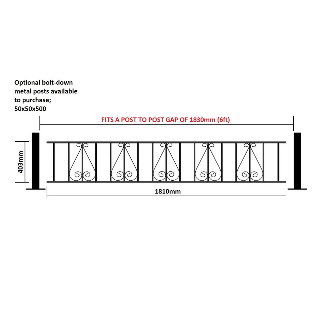 Fits a total post to post GAP of 1830mm (6ft). Railing frame height is 403mm. We already account for the hinge gaps within the width measurement listed.